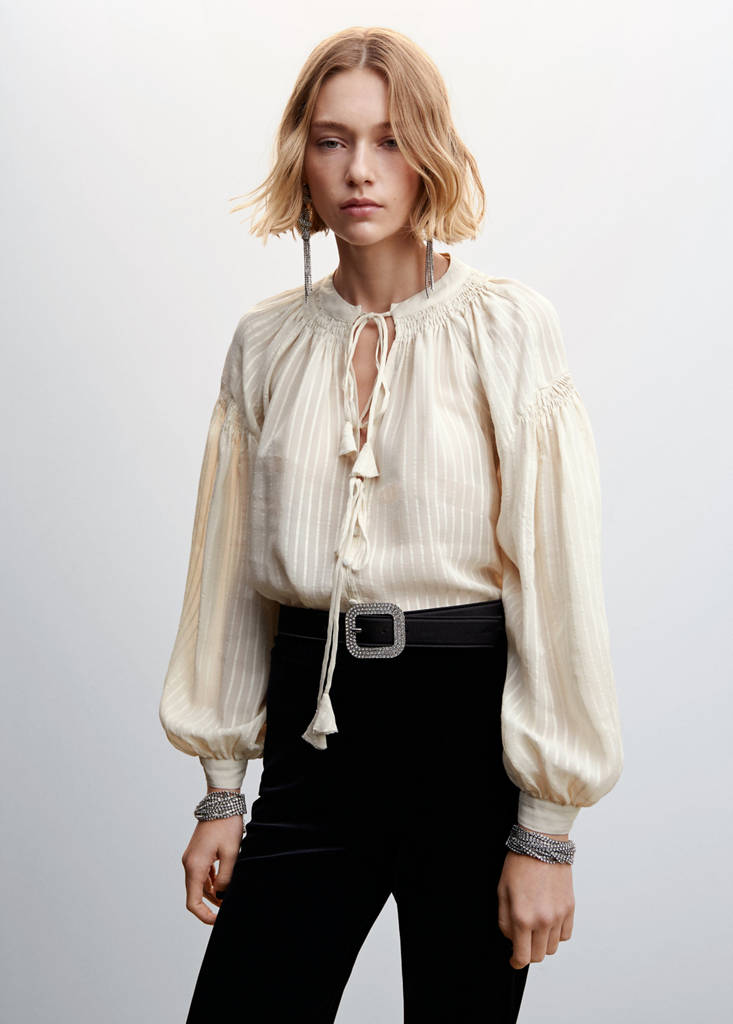 Flowy fabric. Striped texture fabric. Straight design. Boho style. Romantic style. V-neckline with bow closure. Long puffed sleeves. Buttoned cuffs. Button fastening on the front section. Decorative tassels
