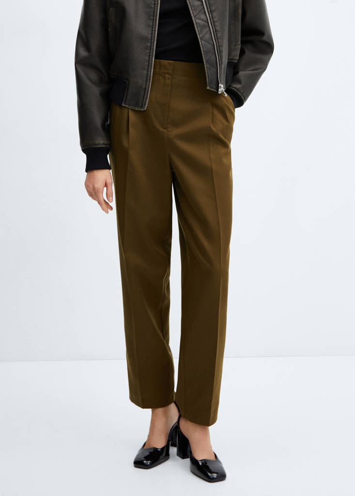 Cotton blend fabric. Straight design. High waist. Concealed button, hook and zip fastening. Two side pockets. Flap pocket on the back. Dart detail. Belt loops