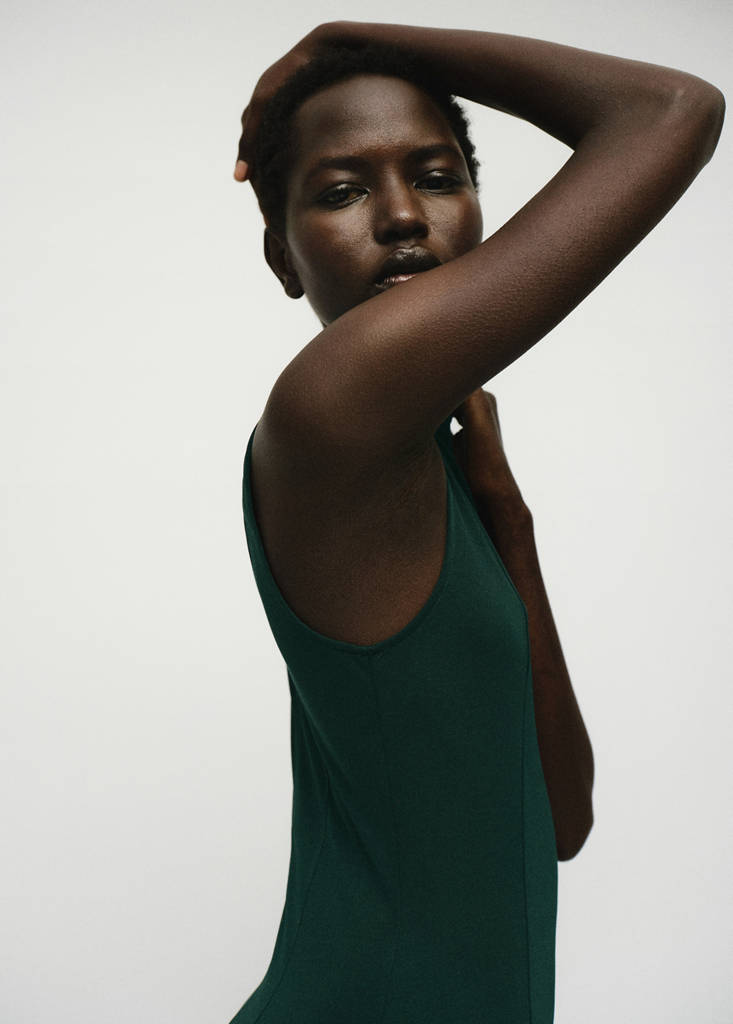 Long design. A-line design. High collar. Sleeveless. Wide straps. Godet detail. Zip fastening on the back section