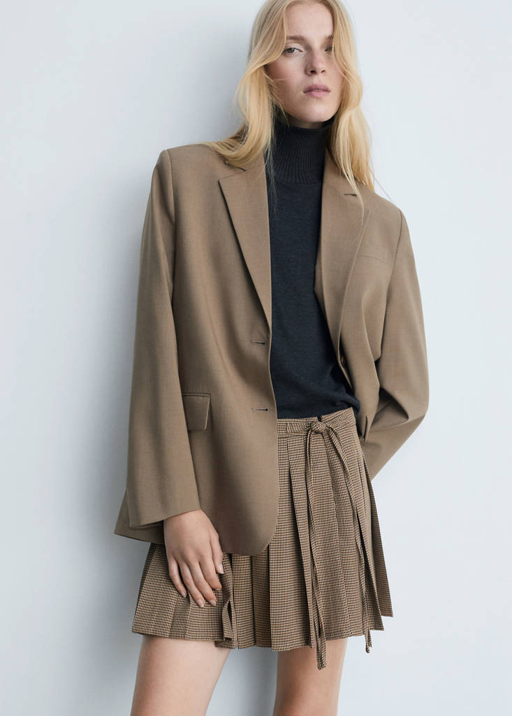 Mid-rise. A-line design. Short design. Patterned design. Straight design. Houndstooth design. Side zip fastening. Side bow fastening. Inner lining
