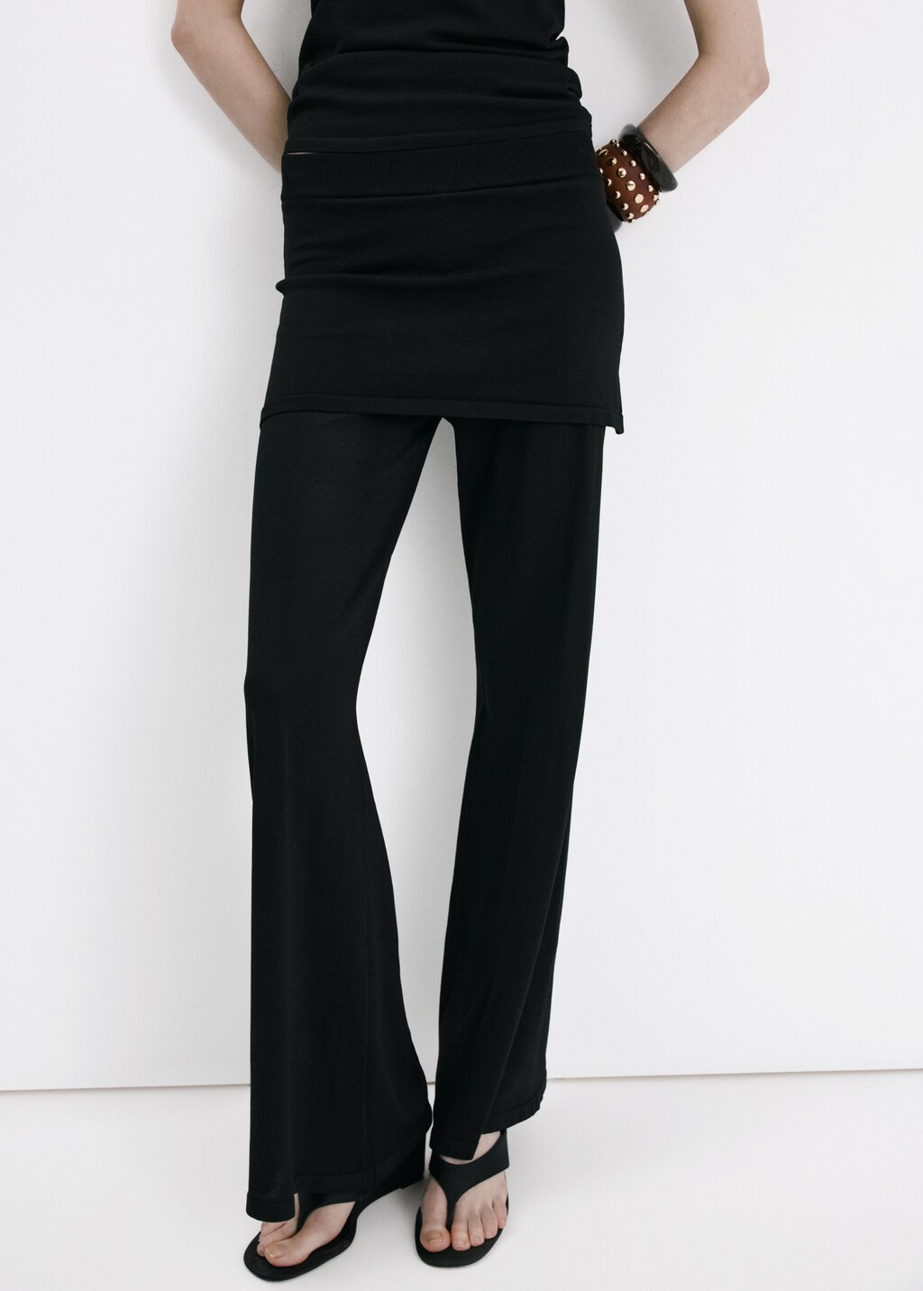Fine knit fabric. Straight design. Combined design. Long design. Mid-rise. No Fastening
