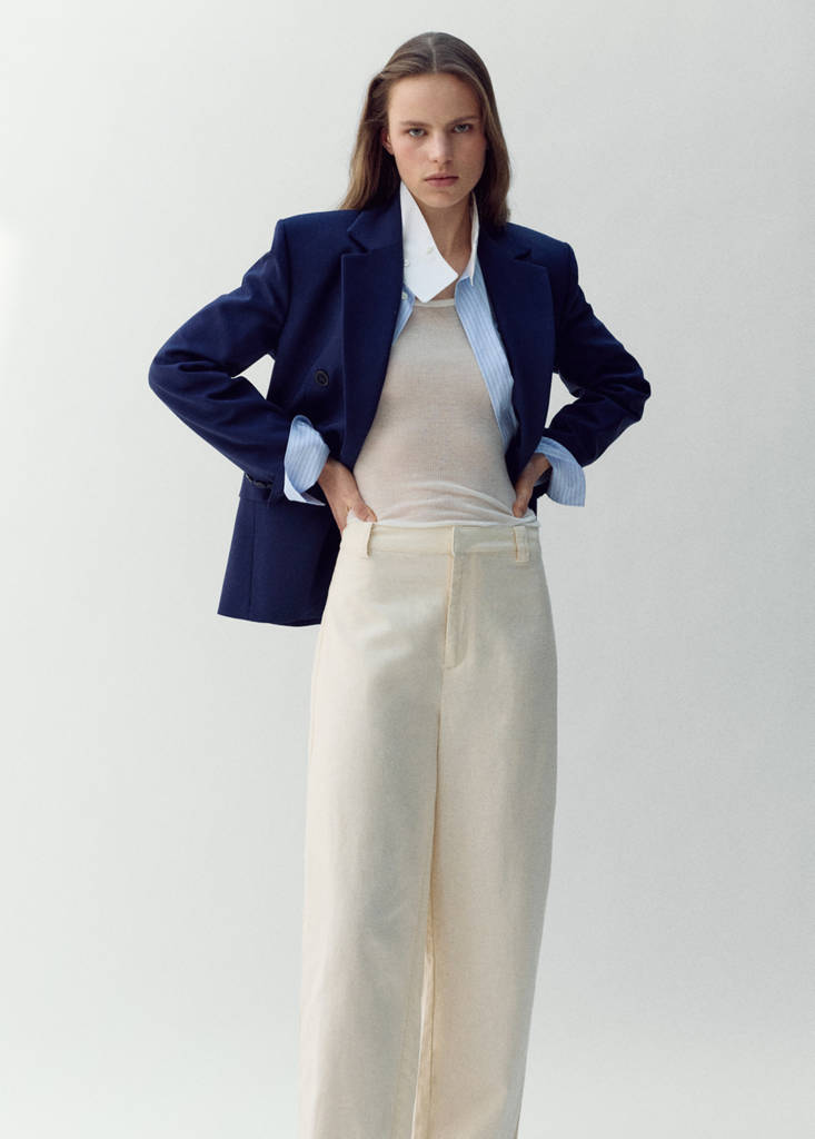 Linen mix. Long design. High waist. Belt loops. Two side pockets. Two patch pockets at the back. Zip, button and concealed hook-and-loop fastener with placket