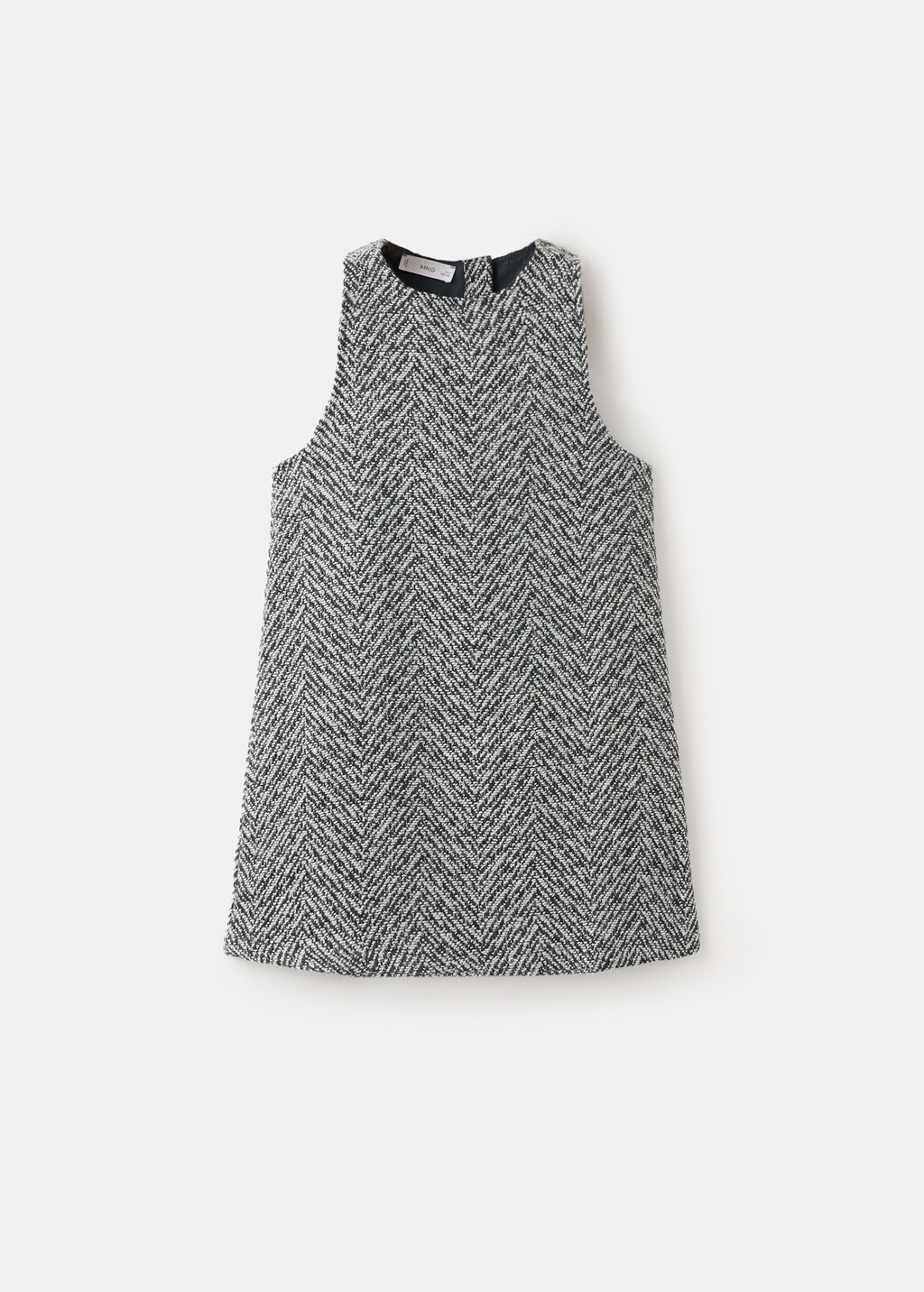 Tweed fabric. Herringbone knit. Lurex fabric. A-line design. Pinafore dress style. Rounded neck with button fastening. Sleeveless. Jacket set available. Total look.