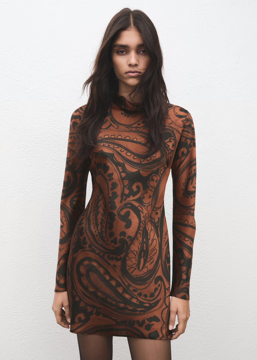 Fluid fabric with satin finish. Straight Design. Short Design. Paisley print. High neck. Long sleeve. Zip fastening on the back section. Available Plus.