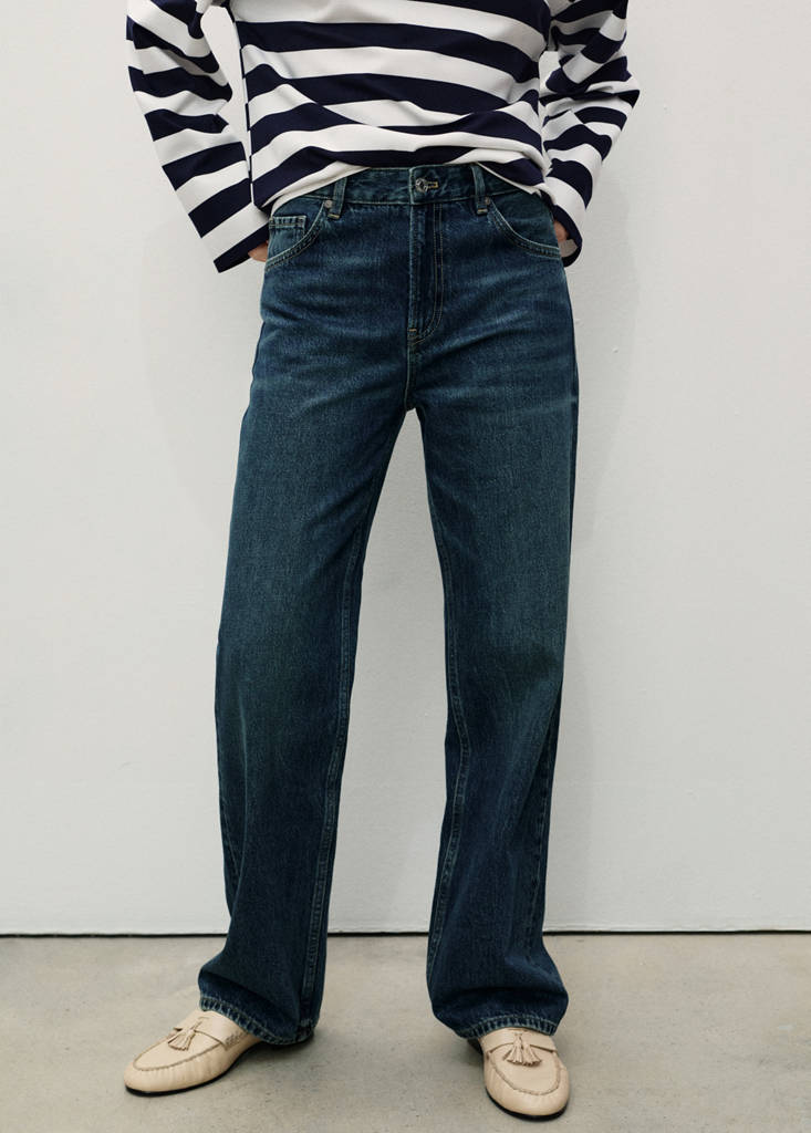 Denim-style cotton fabric. Long design. Straight design. Mid-rise. Belt loops. Five pockets. Front zipper and button closure. Inseam 82 cm. Available Plus