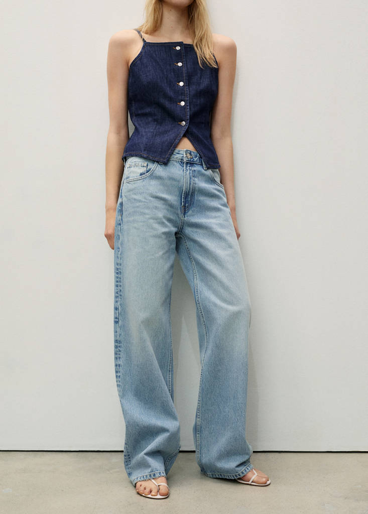 Denim-style cotton fabric. Long design. Straight design. Mid-rise. Belt loops. Five pockets. Front zipper and button closure. Inseam 82 cm